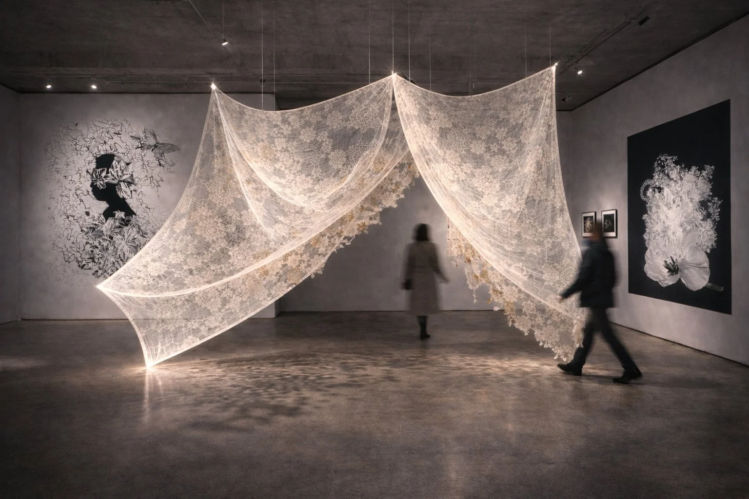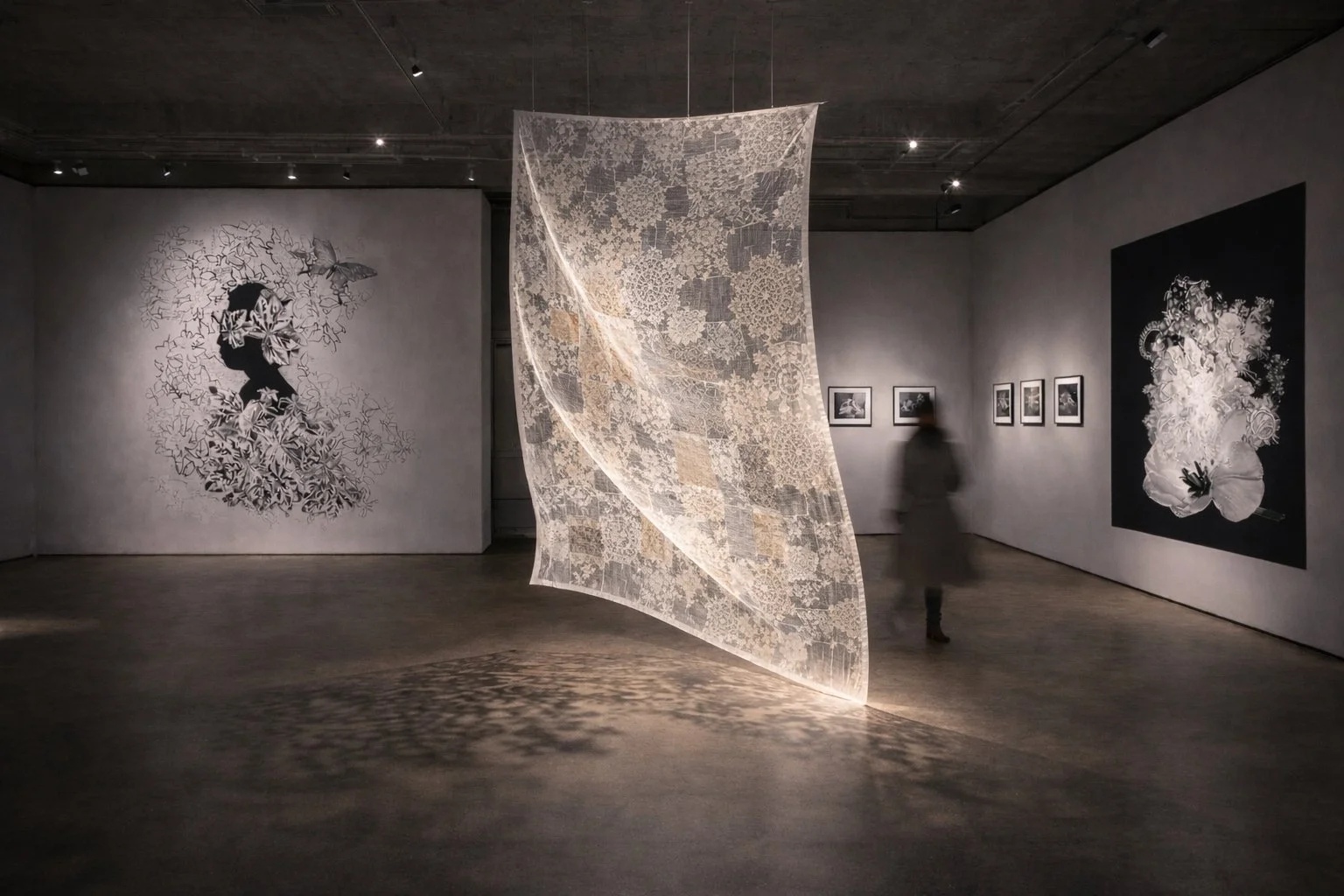 Smaller galleries invite an intimate screen. In larger spaces, it becomes a permeable room inviting movement within and around the veil.