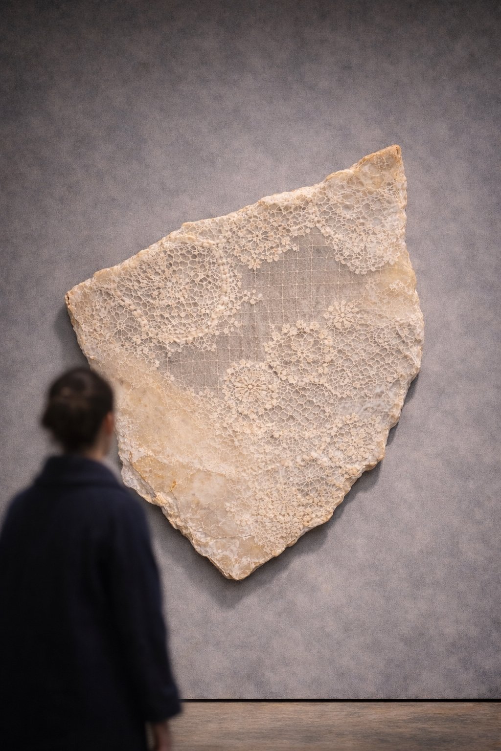 Lace doilies are cast in encaustic and mounted as individual relics.