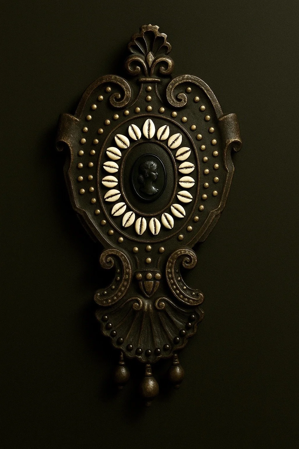 These shields draw from my love of Victorian mourning culture and its intimate artifacts of remembrance. Each piece draws from Irish, Japanese, and West African materials and motifs—reflecting the layered parts of my identity. Together, they imagine how mourning objects might have been adorned in the Victorian era through a fusion of cultures, serving as small shrines to memory, protection and transformation.