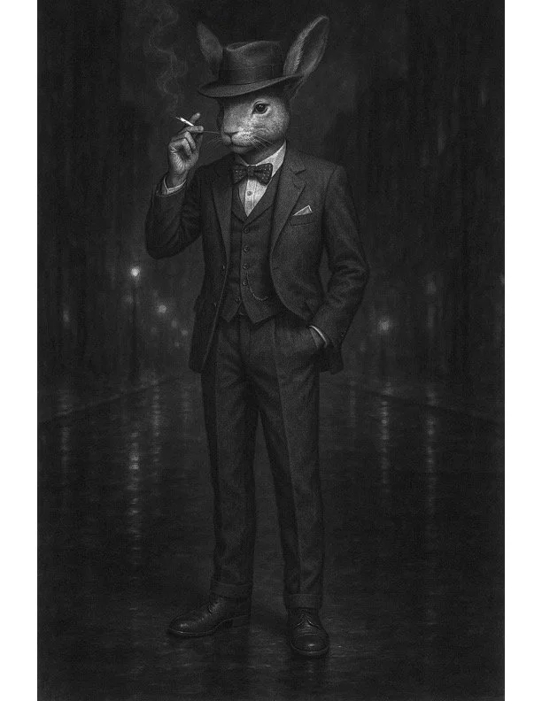 Each tableau—a fox in borrowed finery, a crow lingering in dim hallway light, a rabbit at a bar, a deer-woman at a night crossing—captures the atmosphere of friendships built on unspoken transactions. The noir setting mirrors the psychological terrain we navigated: smoke, secrecy, devotion, ambiguity, tenderness mixed with distortion.